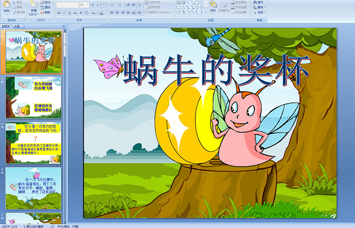 蜗牛的奖杯是一则寓言故事。讲的是善飞的蜗牛获得飞行比赛的冠军奖杯以后,自我陶醉,不思进取,结果翅膀退化,奖杯成了坚硬……